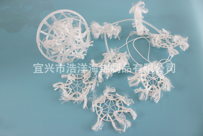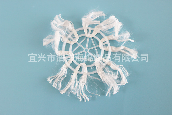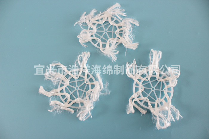 组合填料是在软性填料和半软性填料的基础上发展而成的,它兼有两者的优点。其结构是将塑料圆片压扣改成双圈大塑料环,将醛化纤维或涤纶丝压在环的环圈上,使纤维束均匀分布;内圈是雪花状塑料枝条,既能挂膜,又能有效切割气泡,提高氧的转移速率和利用率。使水气生物膜得到充分交换,使水中的有机物得到处理。